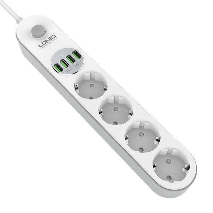 Priza LDNIO SE4432 este perfectă pentru birou sau acasă. Se distinge prin puterea sa de 2500 de wați și vă permite să alimentați 4 dispozitive (de exemplu, televizor, difuzoare) printr-o priză de curent alternativ. În timp ce cele 4 porturi USB vă permit să vă încărcați echipamentul, de exemplu, un laptop sau un powerbank.